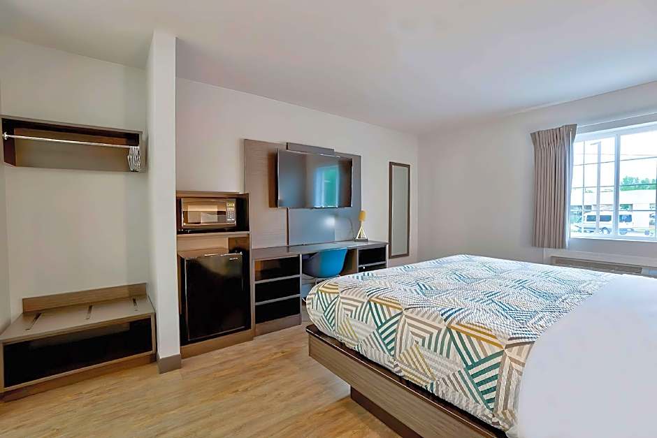 This room features a flat-screen TV, air conditioning and microwave. The bathroom has a roll-in shower.